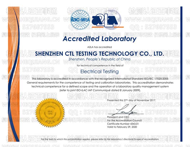 2017 年 11月 28 日,国际实验室正式获得美国 A2LA (American Association for Laboratory Accreditation)认可实验室资质,A2LA Cert. No. :4343.01。 本次国际实验室的A2LA授权涵盖了FCC的设备类型,包括:FCC Part 15B、15C、15E、18、22、24、25、27、73、74、90、95、101;